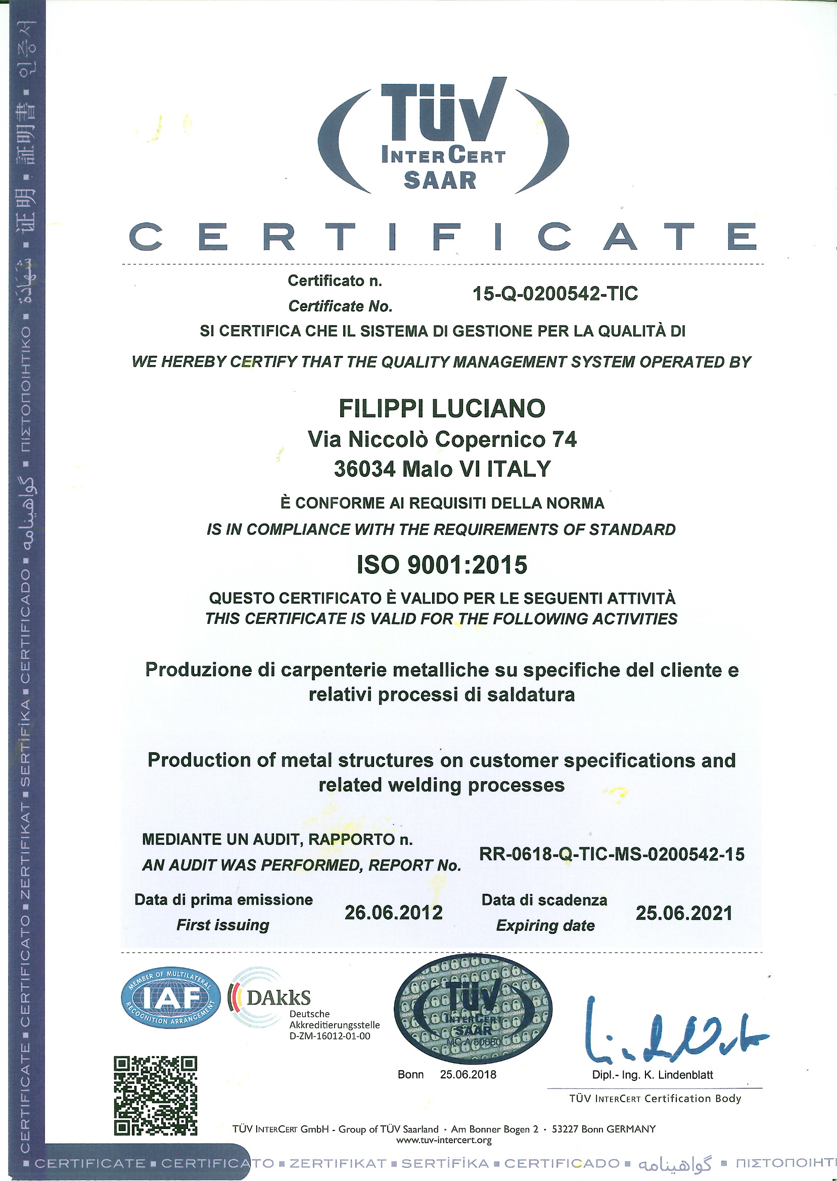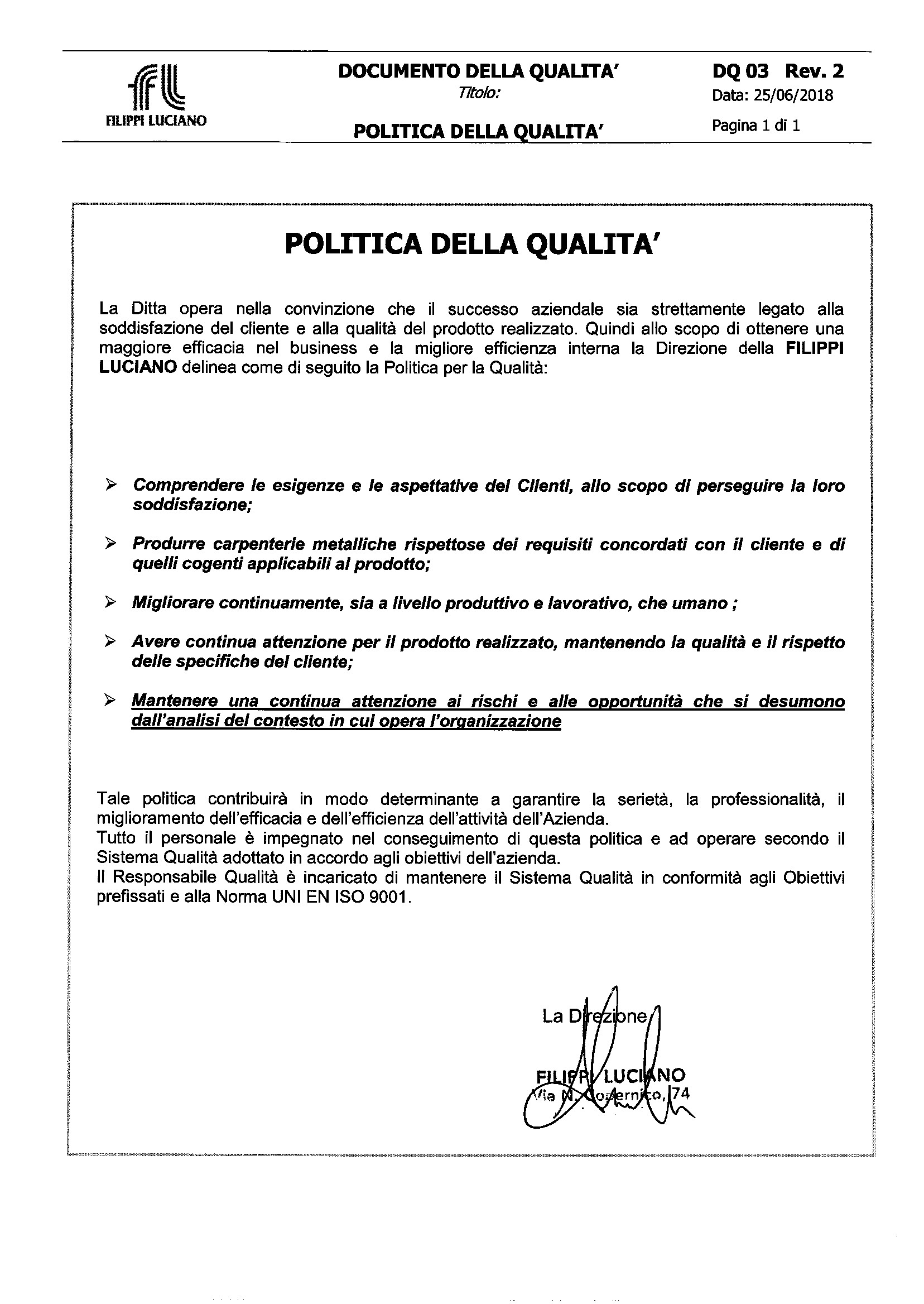 La Ditta opera nella convinzione che il successo aziendale sia strettamente legato alla soddisfazione del cliente e alla qualità del prodotto realizzato. Si allega il documento.